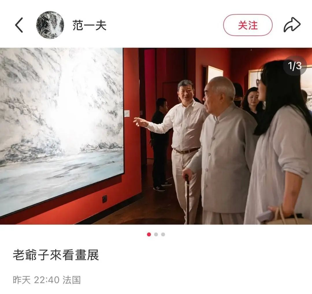 此事一出,立即引发网友广泛关注与热议。然而,仅仅数小时后,在8月16日22点40分,疑似范曾继子范一夫的账号在社交平台上发帖,称“老爷子来看画展”,而其IP地址显示为法国。
