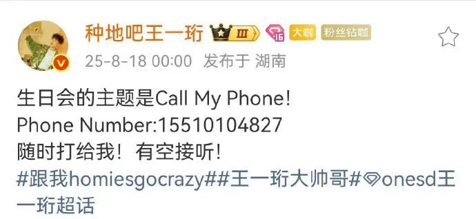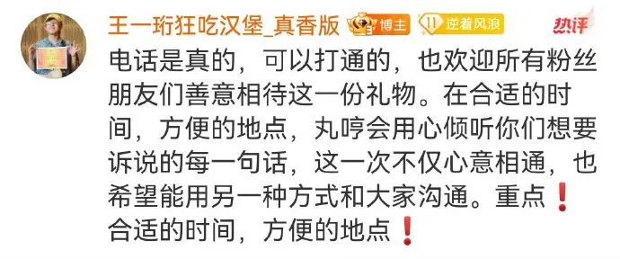 王一珩提醒粉丝,应在“合适的时间、方便的地点”拨打电话,呼吁理性沟通。多名粉丝尝试拨打后确认号码可接通。认证账号“王一珩狂吃汉堡_真香版”发文证实号码有效,并呼吁避免深夜骚扰。