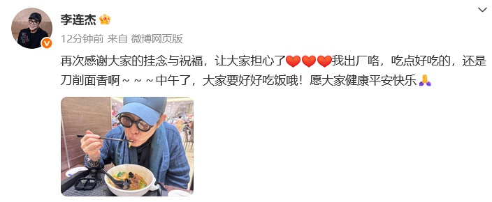 近日,李连杰生病住院登上热搜。8月18日,李连杰出院后再报平安:“再次感谢大家的挂念与祝福,让大家担心了,我出厂咯,吃点好吃的,还是刀削面香啊~~~中午了,大家要好好吃饭哦!愿大家健康平安快乐。”