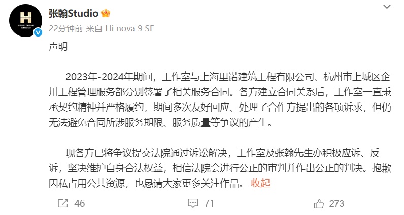 8月18日,@张翰Studio 发声明:2023年-2024年期间,工作室与上海里诺建筑工程有限公司、杭州市上城区企川工程管理服务部分别签署了相关服务合同。各方建立合同关系后,工作室一直秉承契约精神并严格履约,期间多次友好回应、处理了合作方提出的各项诉求,但仍无法避免合同所涉服务期限、服务质量等争议的产生。