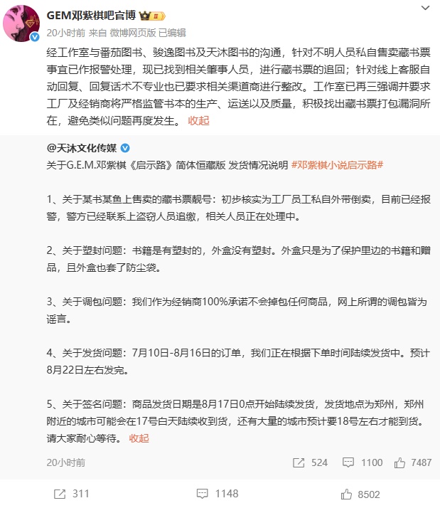 同日,@GEM邓紫棋吧官博 转发了这条博文,并表示,“经工作室与番茄图书、骏逸图书及天沐图书的沟通,针对不明人员私自售卖藏书票事宜已作报警处理,现已找到相关肇事人员,进行藏书票的追回;针对线上客服自动回复、回复话术不专业也已要求相关渠道商进行整改。工作室已再三强调并要求工厂及经销商将严格监管书本的生产、运送以及质量,积极找出藏书票打包漏洞所在,避免类似问题再度发生。”