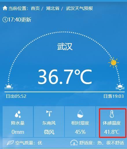 最懂大家的体感温度是多少?比如,武汉17时40分,气温36.7℃,体感温度41.8℃。