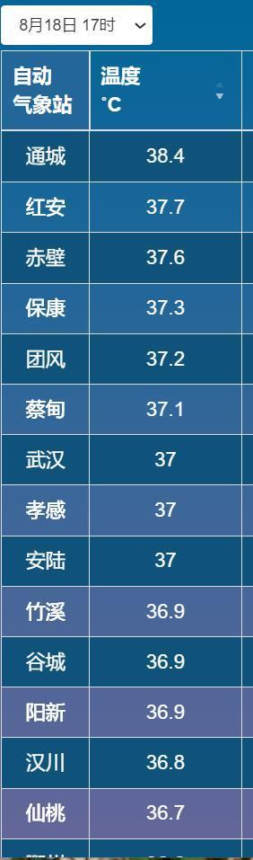 湖北全省来看,截至下午3时,全省超9成县市最高气温突破35℃,其中有30个县市达37℃及以上,下午5时,通城以38.4℃居首。
