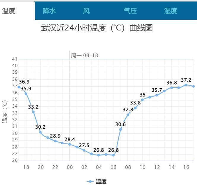 气象监测显示,以代表武汉气象数据的国家级气象站为例,18日早间6时,武汉仅26.8℃,7时就冲到30.6℃,上午10时已达35℃,午后4时冲高到37.2℃回落。