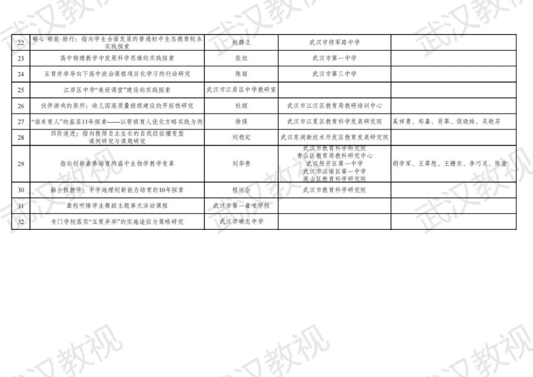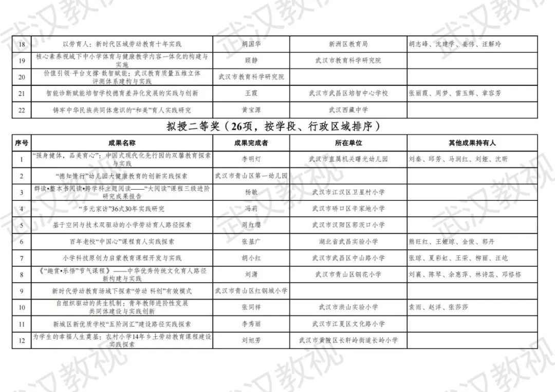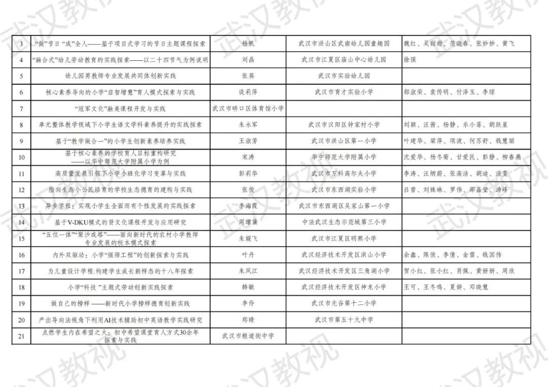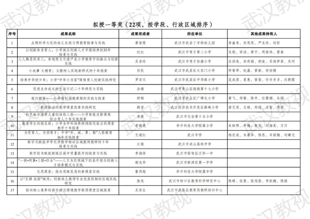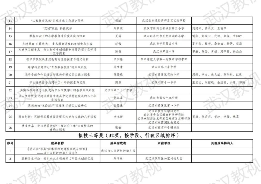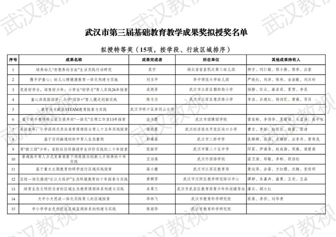 按照工作程序,现将武汉市第三届基础教育教学成果奖拟授奖名单予以公示,公示时间为2025年8月18日—25日。公示期间如有异议,可以向市教育局反映。