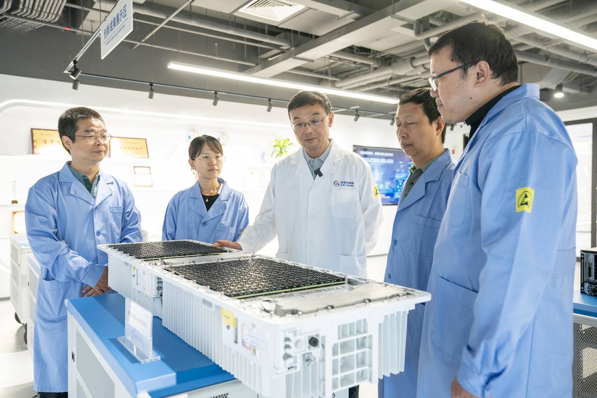 中信科移动新一代信息通信技术实验室,孙韶辉(右二)与科研人员一起交流6G设备技术细节。(湖北日报全媒记者 魏铼 摄)