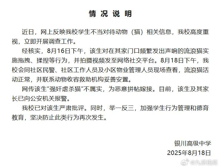 网传该生“强奸虐杀猫”不属实,为恶意拼帖嫁接。目前,该生及其家长已向公安机关报警。学校已对该生严肃批评。同时,举一反三,加强学生行为管理和德育教育,坚决防止此类行为再次发生。