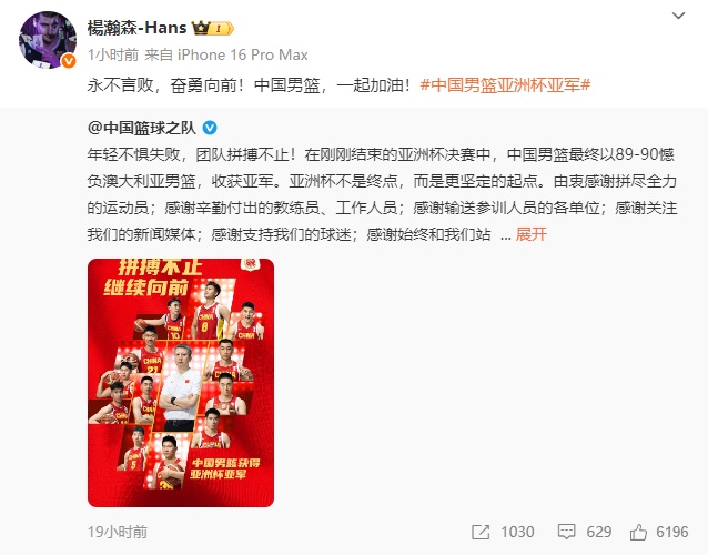 赛后,球员杨瀚森在社交平台发文为球队鼓劲:“永不言败,奋勇向前!中国男篮,一起加油!”