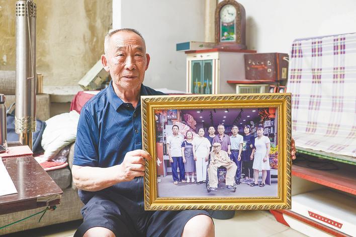 七月十六日,利川城区,七十九岁的何家祯在家中展示去年拍摄的全家福。
