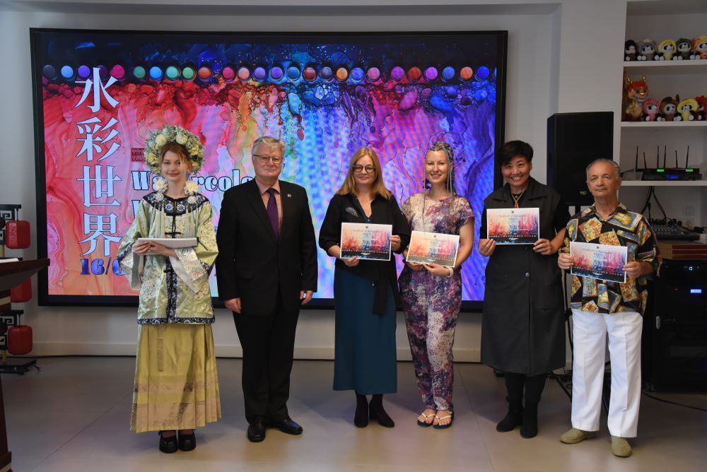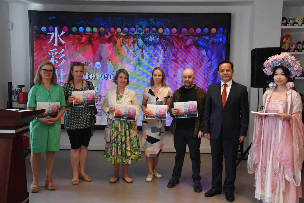 8月16日,“水彩世界—第二届中拉国际水彩艺术交流展”开幕式上,中国驻拉脱维亚大使唐松根(右二)为在场艺术家颁发参展证书。新华社发(里加中国文化中心供图)