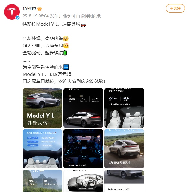 据特斯拉官方消息,8月19日,特斯拉在中国官网上线了一款六座SUV——Model Y L,售价33.9万元起,预计交付时间2025年9月。