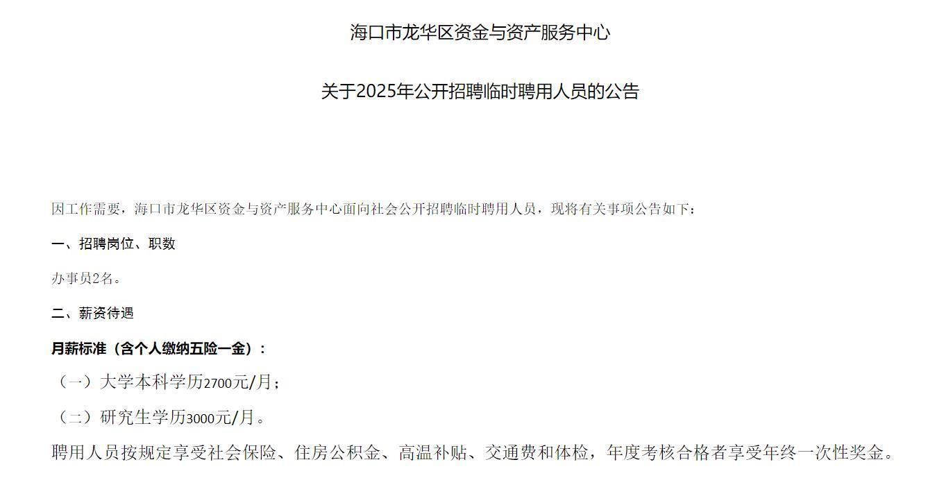 海口市龙华区人民政府网站8月18日发布《海口市龙华区资金与资产服务中心关于2025年公开招聘临时聘用人员的公告》和《中共海口市龙华区旅游和文化体育局关于2025年公开招聘临时聘用人员的通知》。薪资待遇含个人缴纳五险一金,本科生都是2700月/月,研究生3000元/月。8月11日,该网站发布了《海口市龙华区发展和改革委员会关于2025年公开招聘临时聘用人员的公告》,今年6月,该网站发布《海口市龙华区龙桥镇人民政府关于2025年公开招聘临时聘用人员的公告》,也是同样的月薪。
