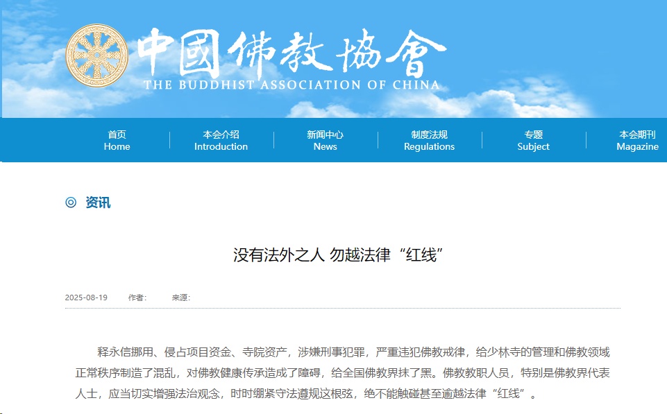 8月19日,中国佛教协会官网发布文章《没有法外之人 勿越法律“红线”》。