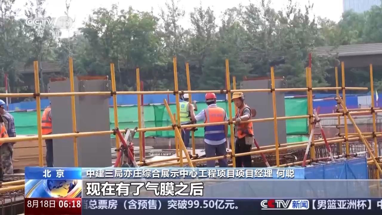 中建三局亦庄综合展示中心工程项目项目经理 何聪:因为现在在汛期,如果没有这个基坑气膜,现在土方作业可能只能完成70%到80%,有了气膜之后,我们现在开始地上结构施工了,工期大概有两个月的富余。