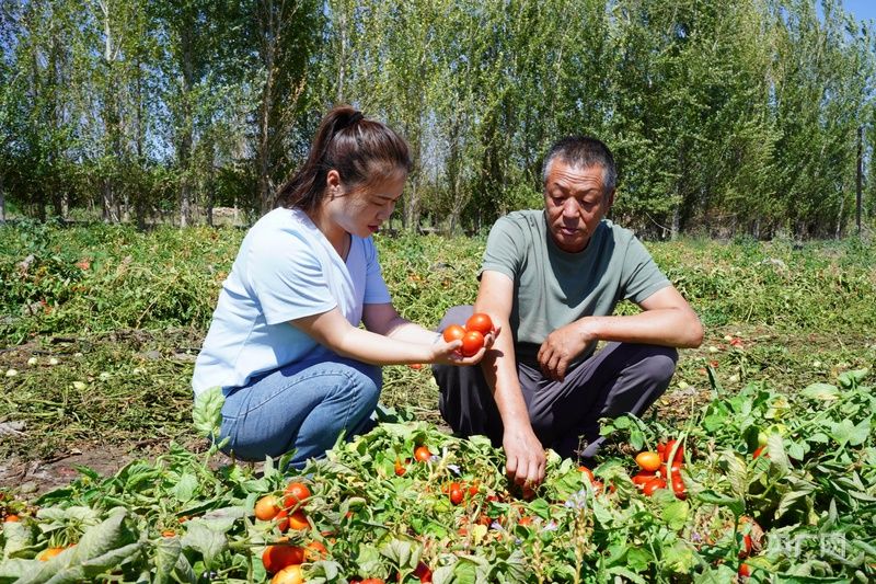 农技人员正在查看番茄长势情况 (央广网发 吴欣昊 摄)