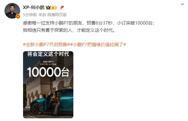 稍晚,小鹏汽车董事长、CEO何小鹏发文称:感谢每一位支持小鹏P7的朋友,预售6分37秒,小订突破10000台;我相信只有勇于探索的人,才能定义这个时代。