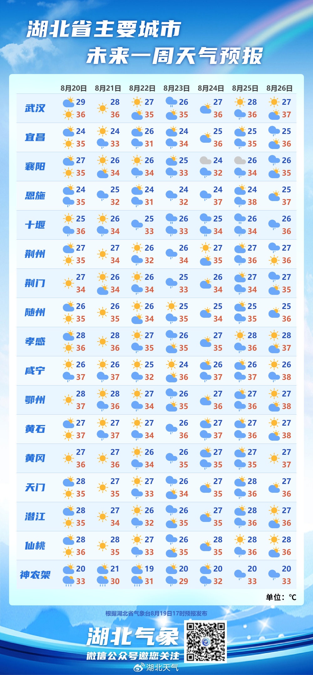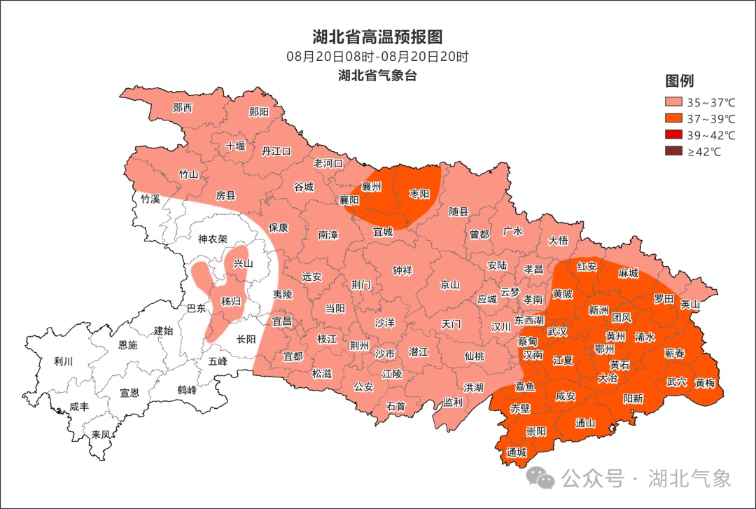 预计20日白天,除鄂西山区外,我省大部分地区最高气温将升至35℃以上,其中襄阳东部、武汉、鄂州、黄冈、黄石、咸宁可达37℃以上,请注意防范。