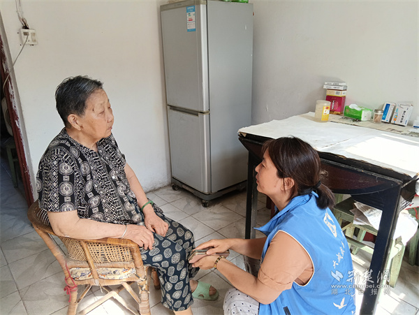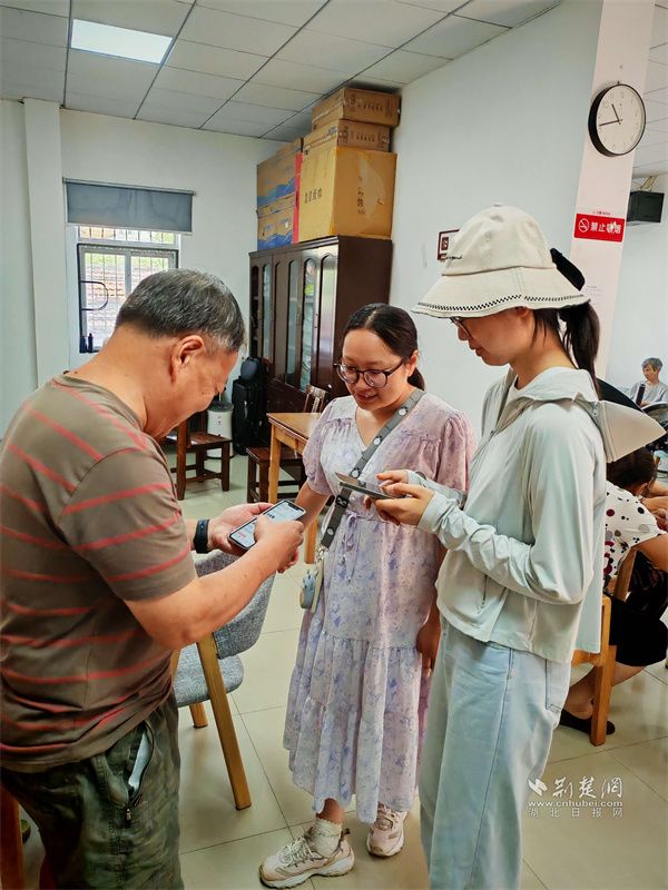 网格员向老年人演示手机网购时需注意事项。 通讯员供图