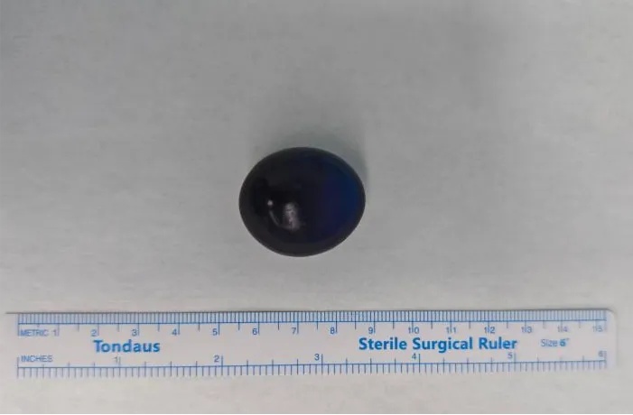 紧急开腹手术后,划开肠壁,一个蓝褐色的小圆球掉了出来。它就像一颗剥了皮的葡萄。用镊子夹它时,滑溜溜的,还特别脆。没错,就是“水宝宝”。