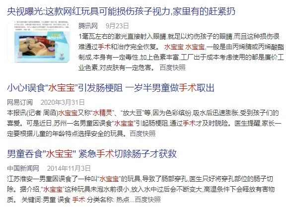 如果家长发现儿童误吞“水宝宝”产品,千万不要给孩子喝水,也不要尝试牛奶等偏方催吐,避免加速“水宝宝”在体内的膨胀速度,应立即送医进行救治。