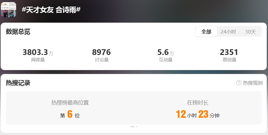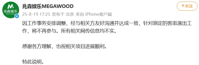 19日,兆森娱乐发声明称合诗雨不再客串天才女友,“因工作事务安排调整,经与相关方友好沟通并达成一致,针对原定的客串演出工作,将不再参与。所有相关网传信息均不实。”