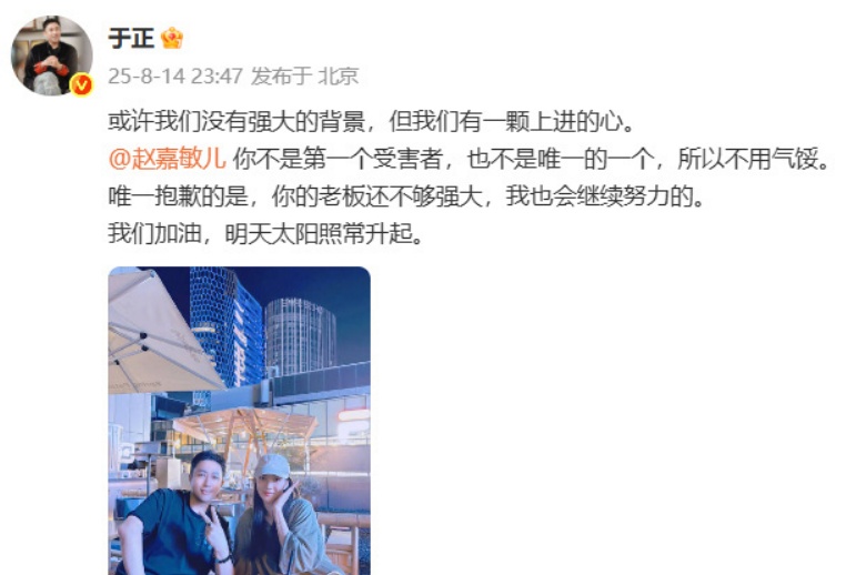 据悉,8月14日晚,于正晒出和旗下女星赵嘉敏的合照表示:“或许我们没有强大的背景,但我们有一颗上进的心。你不是第一个受害者,也不是唯一的一个,所以不用气馁。”还道歉称“你的老板还不够强大,我也会继续努力的”。