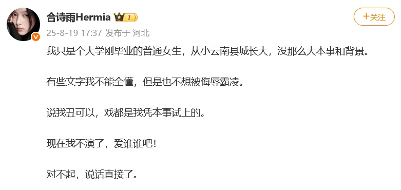 合诗雨也发文:“我只是个大学刚毕业的普通女生,从小云南县城长大,没那么大本事和背景。有些文字我不能全懂,但是也不想被侮辱霸凌。说我丑可以,戏都是我凭本事试上的。现在我不演了,爱谁谁吧!对不起,说话直接了。”