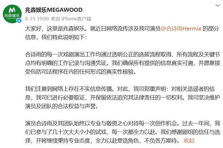8月15日,合诗雨经纪公司@兆森娱乐MEGAWOOD 回应,称合诗雨的每一次戏剧演出工作均通过透明公正的选拔流程取得,所有流程及关键节点均有明确的工作记录与沟通凭证。“我们确保所有提供的信息真实可溯,并愿意接受包括司法程序在内的任何形式的真实性核验。”