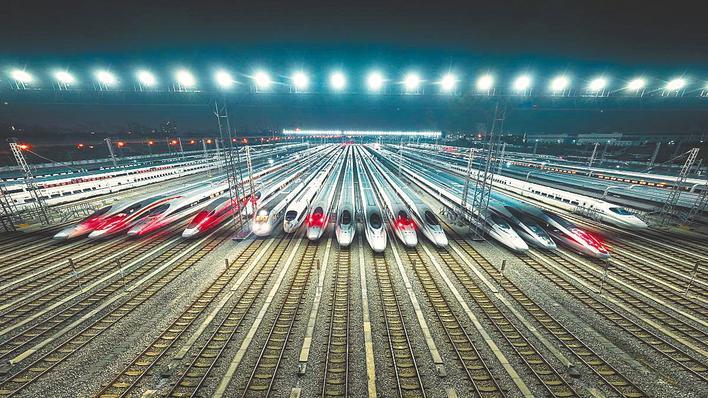 动车组在武汉动车段集结待发。(湖北日报通讯员 邹政 摄)