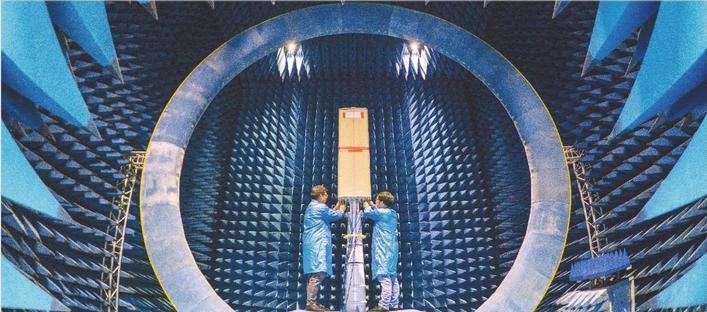 中国信科集团无线产业园,技术人员在多探头球面近场检测实验室测试通信基站天线产品。(湖北日报全媒记者 魏铼 摄)