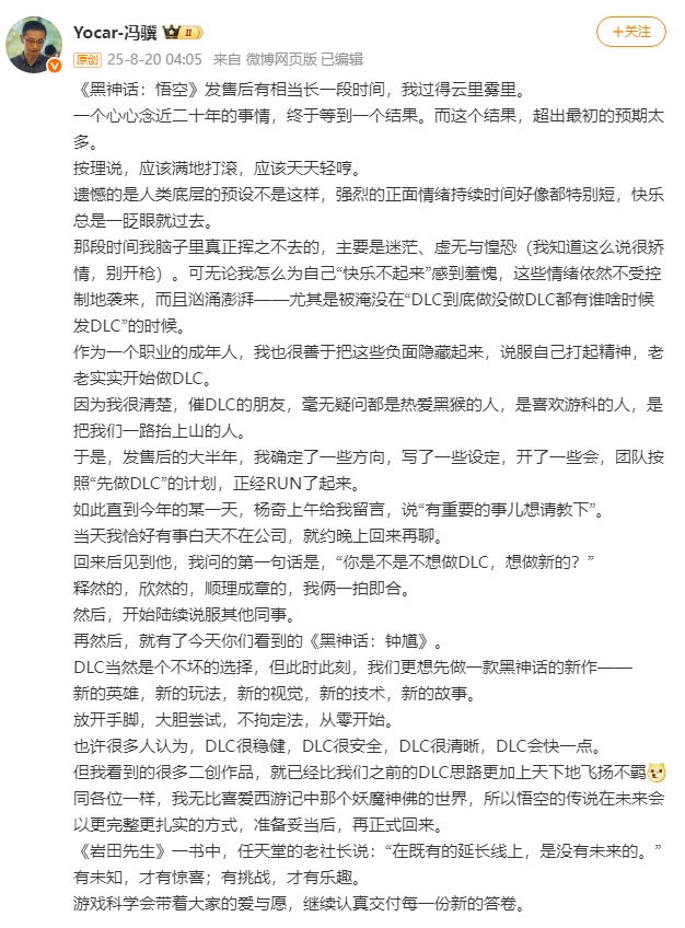 游戏创始人、CEO,《黑神话:悟空》制作人冯骥凌晨发文解释为何先推出新作《黑神话:钟馗》,而不是DLC(Downloadable Content,可下载内容)。他表示,《黑神话:悟空》发售后有相当长一段时间,他过得云里雾里。