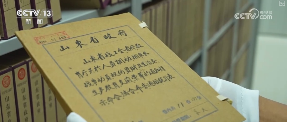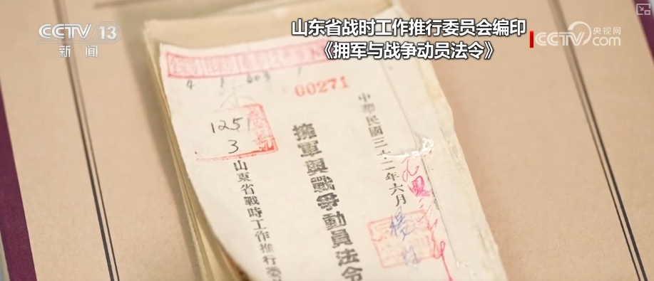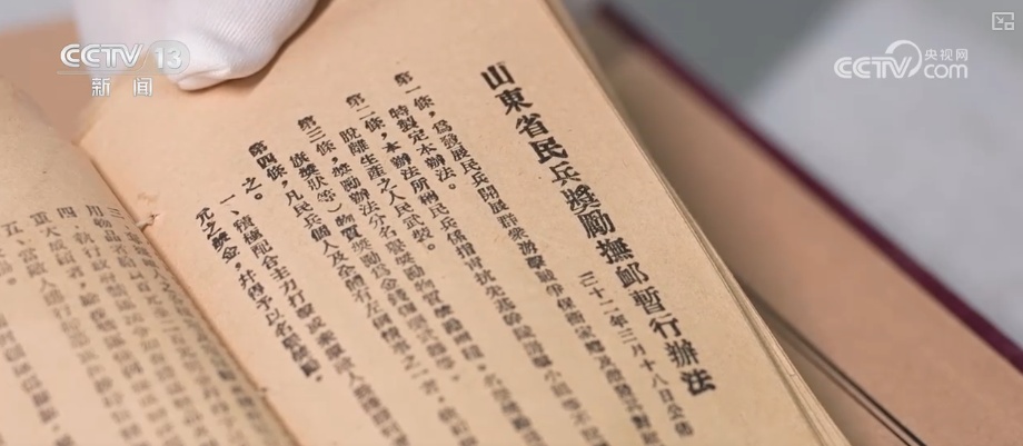 山东省档案馆编辑研究处二级巡视员陈孟继介绍,这部法令的效果,比如到抗战后期,山东抗日根据地正规军达到27万、民兵武装达到200万人。还比如,最后一粒米送去做军粮、最后一块布送去做军装、最后一个娃送他上战场,这种全民拥军、参战的生动氛围。
