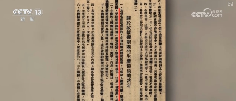 国家档案局政策法规司编研处处长贾坤介绍,他们收录了一件1941年9月,山东省战时工作推行委员会关于厉行节约,减发一个月菜金的通知。通知中指出,停发菜金的办法是10月减发半个月,11月减发半个月,两个半个月为一个月,以便陆续生产、逐渐节约。这里有一件关于政权机关团队生产节约的决定,其中指出,加强生产提倡节约是目前解决经济困难,打破敌人经济封锁,坚持敌后抗战的重要工作。