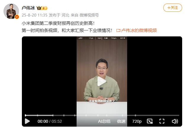 8月20日,小米集团总裁@卢伟冰 发文表示,小米集团第二季度财报再创历史新高。和大家汇报一下业绩情况。