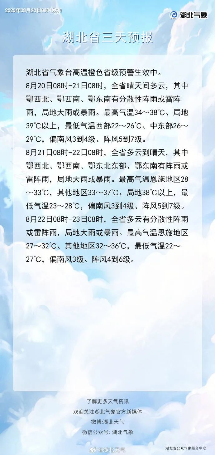 预计今明两天全省大部晴热天气持续,西部地区有分散性阵雨或雷阵雨,局地雨量较大。今天湖北省气象台高温橙色省级预警生效中:预计20日白天,除鄂西山区外,我省大部分地 区最高气温将升至35℃以上,其中襄阳东部、武汉、鄂州、黄 冈、黄石、咸宁可达37℃以上,请注意防范。