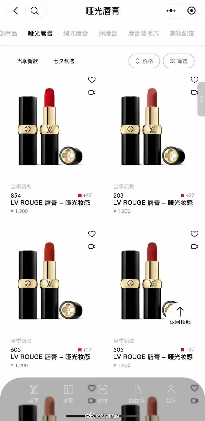8月20日,LV美妆小程序上线首批美妆产品。其中包括多款哑光妆感、缎光妆感的唇膏,定价1200元,唇膏替换装定价510元;此外,10款不同色号的润唇膏定价同样为1200元。