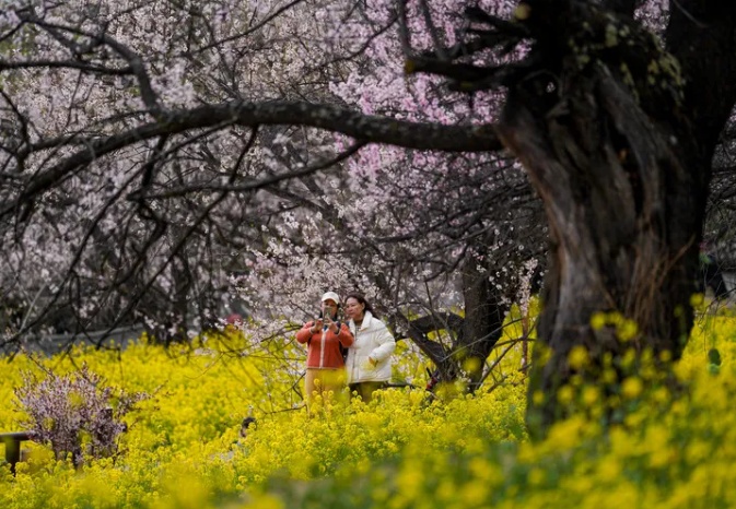 游客在西藏林芝市嘎拉村赏花(2025年4月2日摄)。新华社记者 晋美多吉 摄