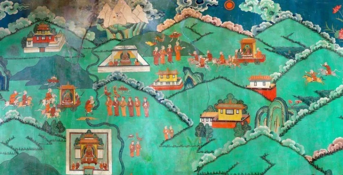 这幅布达拉宫壁画讲述了公元7世纪,吐蕃赞普松赞干布统一青藏高原,迎娶唐文成公主,“汉藏一家亲”的传世佳话(资料照片)。新华社发
