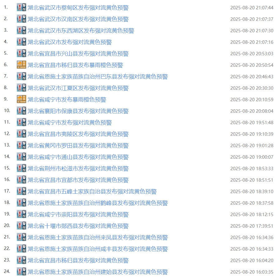 武汉市气象台2025年08月20日21时07分发布强对流黄色预警信号:预计未来6小时,中心城区、经开、蔡甸、东西湖部分街道(乡镇)将出现短时强降水等强对流天气,局地阵风7-9级,并伴有雷电,最大小时雨强20-40毫米,致灾风险较高,请注意防范。