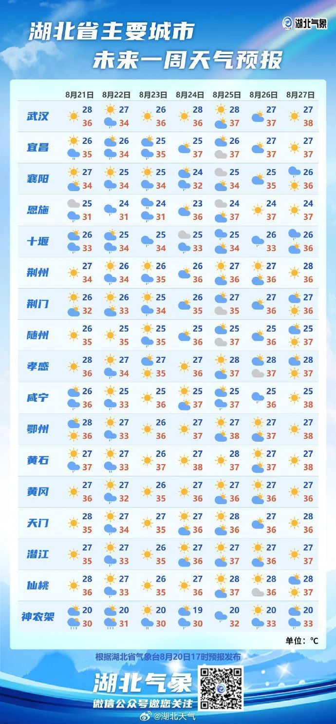 明天,恩施地区气温降至28~33℃,其他地区33~37℃、局地38℃以上。后天,全省降雨增多,有分散性阵雨或雷阵雨,局地大雨或暴雨,高温天气暂时减弱。