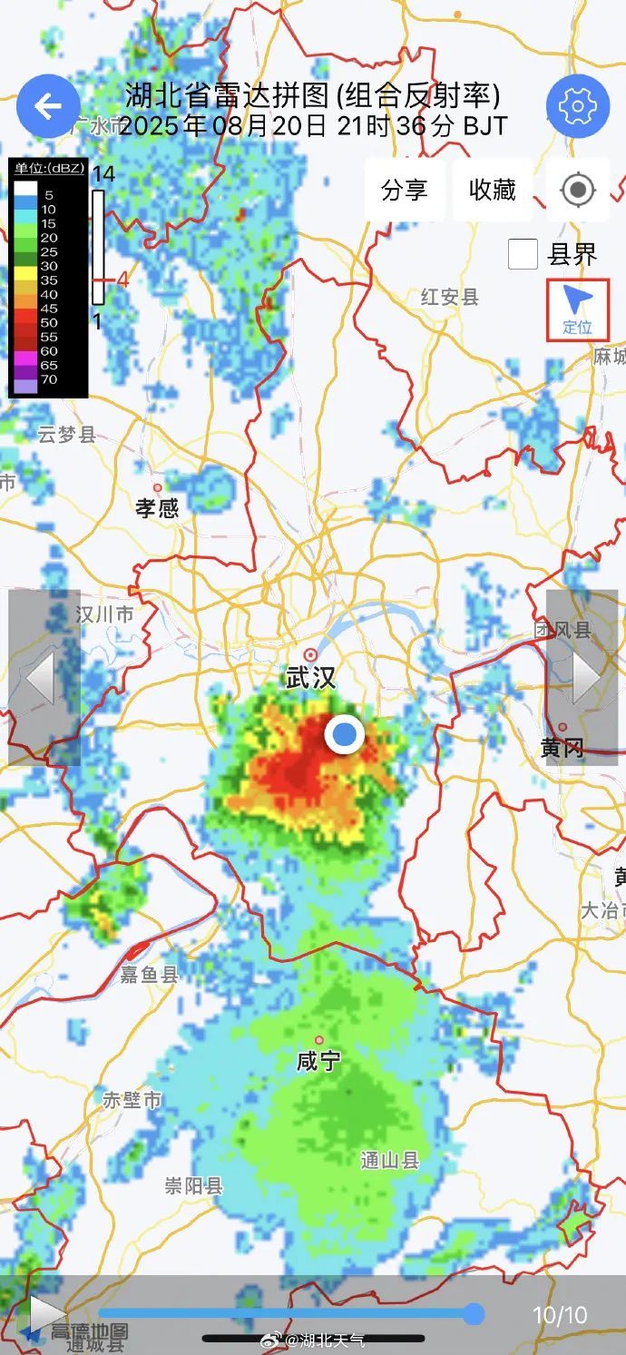 据湖北天气,今晚武汉南部出现较强回波,正快速向北方移动。你那边打闪了吗?注意关好门窗防范强对流天气!