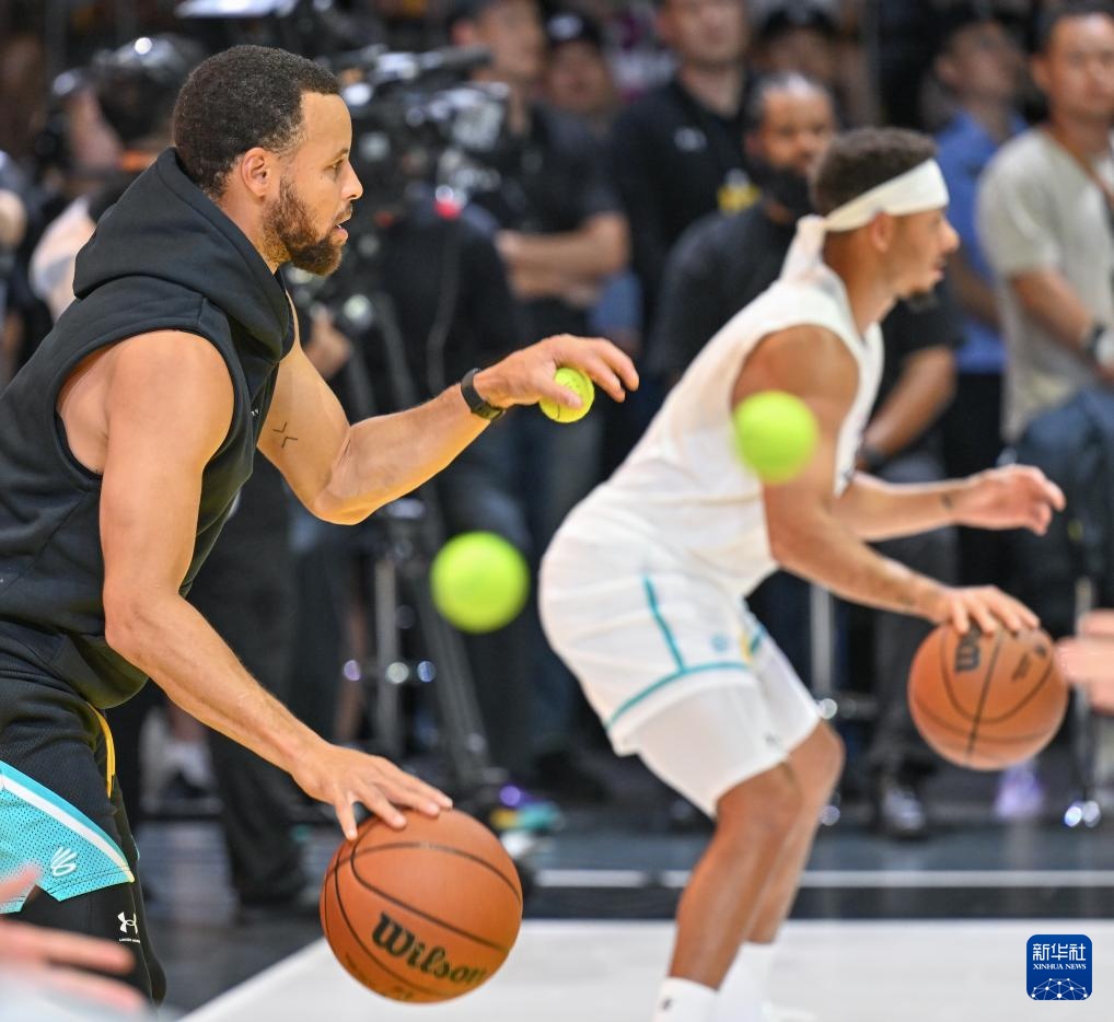 8月20日,姚明(右上)、库里与来自四川的乡村女子篮球队队员互动。