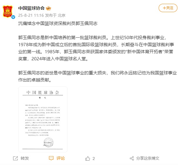 8月21日,@中国篮球协会 发文悼念中国篮球资深裁判员郭玉佩同志。8月16日中国篮球资深裁判员、中国篮球名人堂成员郭玉佩先生逝世,享年93岁。