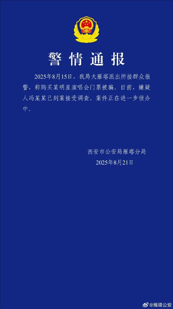 2025年8月15日,我局大雁塔派出所接群众报警,称购买某明星演唱会门票被骗。目前,嫌疑人冯某某已到案接受调查。案件正在进一步侦办中。