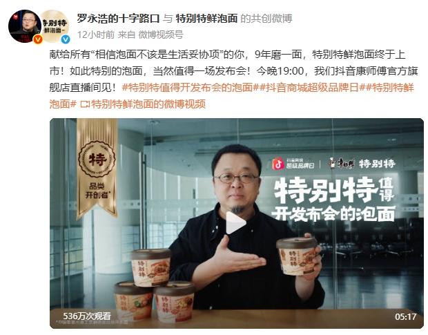 8月21日晚7时,产品经理罗永浩与搭档王拓准时出现在康师傅官方抖音直播间,宣布筹备九年的“特别特鲜泡面”正式上市。