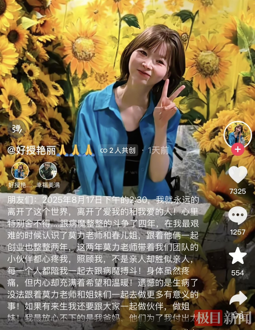 “2025年8月17日下午的2:30,我就永远的离开了这个世界,离开了爱我的人和我爱的人!心里特别舍不得……跟病魔整整的斗争了四年,在我最艰难的时候认识了莫力老师和春儿姐,跟着他俩一起创业也整整两年,这两年莫力老师带着我们团队的小伙伴都心疼我,照顾我,不是亲人却胜似亲人,每一个人都陪我一起去跟病魔搏斗!