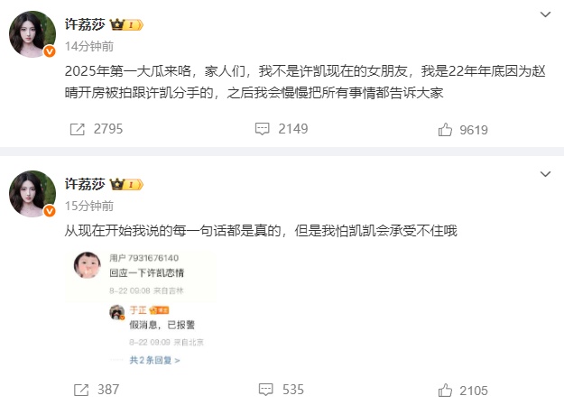 刚刚,恋情女主角@许荔莎 连发聊天博文,喊话于正:“从现在开始我说的每一句话都是真的,但是我怕凯凯会承受不住哦 。”还表示自己不是许凯现在的女朋友,“我是22年年底因为赵晴开房被拍跟许凯分手的。”