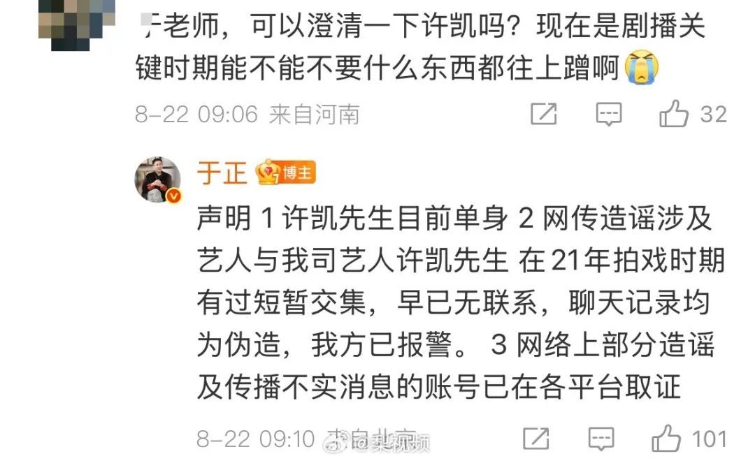 网友求证于正恋情真实性,于正回复称,许凯先生目前单身;网传造谣涉及艺人与我司艺人许凯先生,在21年拍戏时期有过短暂交集,早已无联系,聊天记录均为伪造,我方已报警;网络上部分造谣及传播不实消息的账号已在各平台取证。