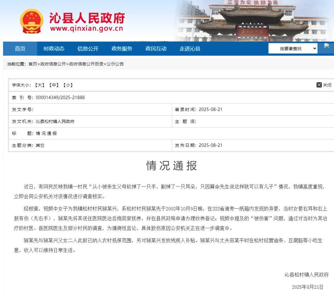 8月21日,山西省长治市沁县松村镇人民政府发布了关于女子称幼时被父母虐待致残事件通报。内容如下: