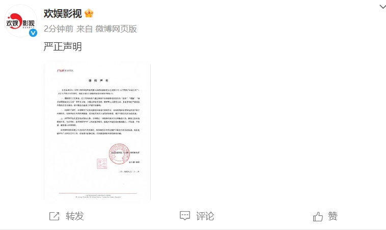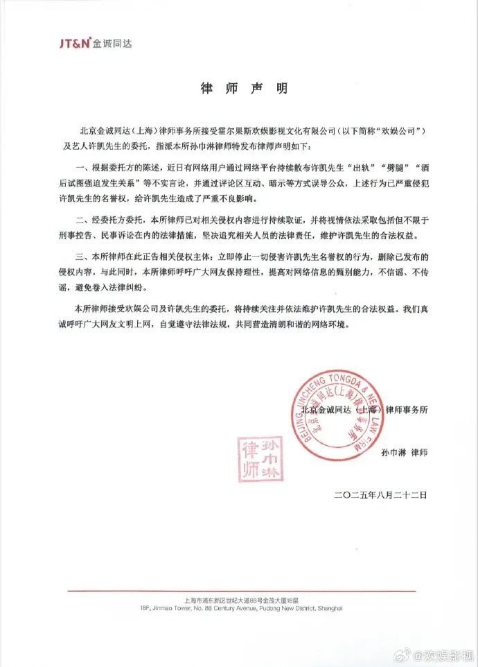 8月22日,欢娱影视发布严正声明,称有用户发布许凯“出轨”“劈腿”“酒后试图强迫发生关系”等不实言论,并误导公众,已严重侵犯许凯名誉权。律师已对侵权内容进行取证,并将采取法律措施,坚决追究法律责任。